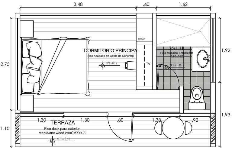 Piso 1: Sala + kitchenette + 1 baño completo + terraza.